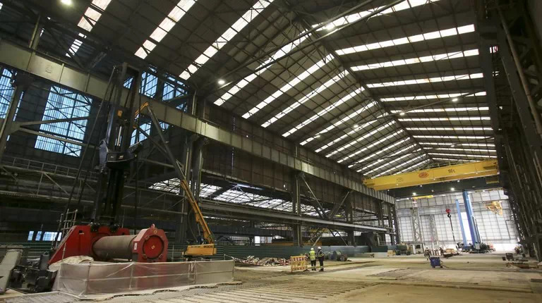 Sin embargo, la factoría necesita mejorar sus instalaciones e incrementar sus capacidades para dar respuesta a esa previsible demanda. Ha comenzado a dar los primeros pasos con la habilitación de la fábrica de monopiles en el taller de bloques planos, que cortará las primeras planchas de acero para la primera unidad la segunda quincena del próximo mes de diciembre y prevé su inauguración oficial, ya totalmente operativa, para febrero. En la nave se encuentran la máquina plegadora, las de soldadura longitudinal por arco sumergido, y las cuatro nuevos puentes grúa, que se vienen a sumar a los ya existentes en el taller, además de otros elementos.